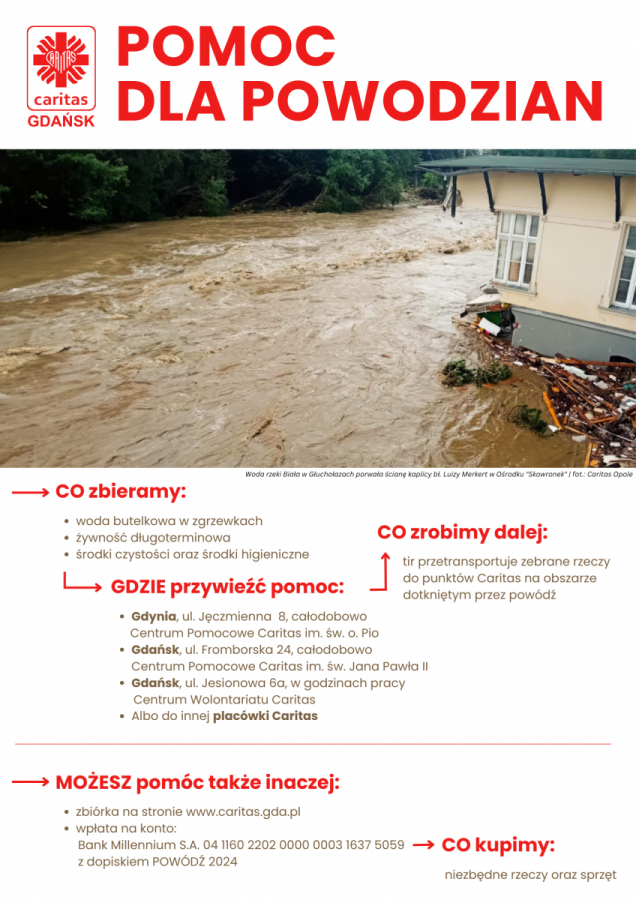 1. Zbiórka pieniężna prowadzona przed wszystkimi kościołami w Polsce w niedzielę, 22 września br. zarządzona przez Przewodniczącego Konferencji Episkopatu Polski TUTAJ. Pieniądze można też przekazywać na numer konta: Bank Millenium S.A.: 04 1160 2202 0000 0003 1637 5059 - Caritas Archidiecezji Gdańskiej (Al. Niepodległości 778; 81-805 Sopot) z dopiskiem: "Powódź 2024".